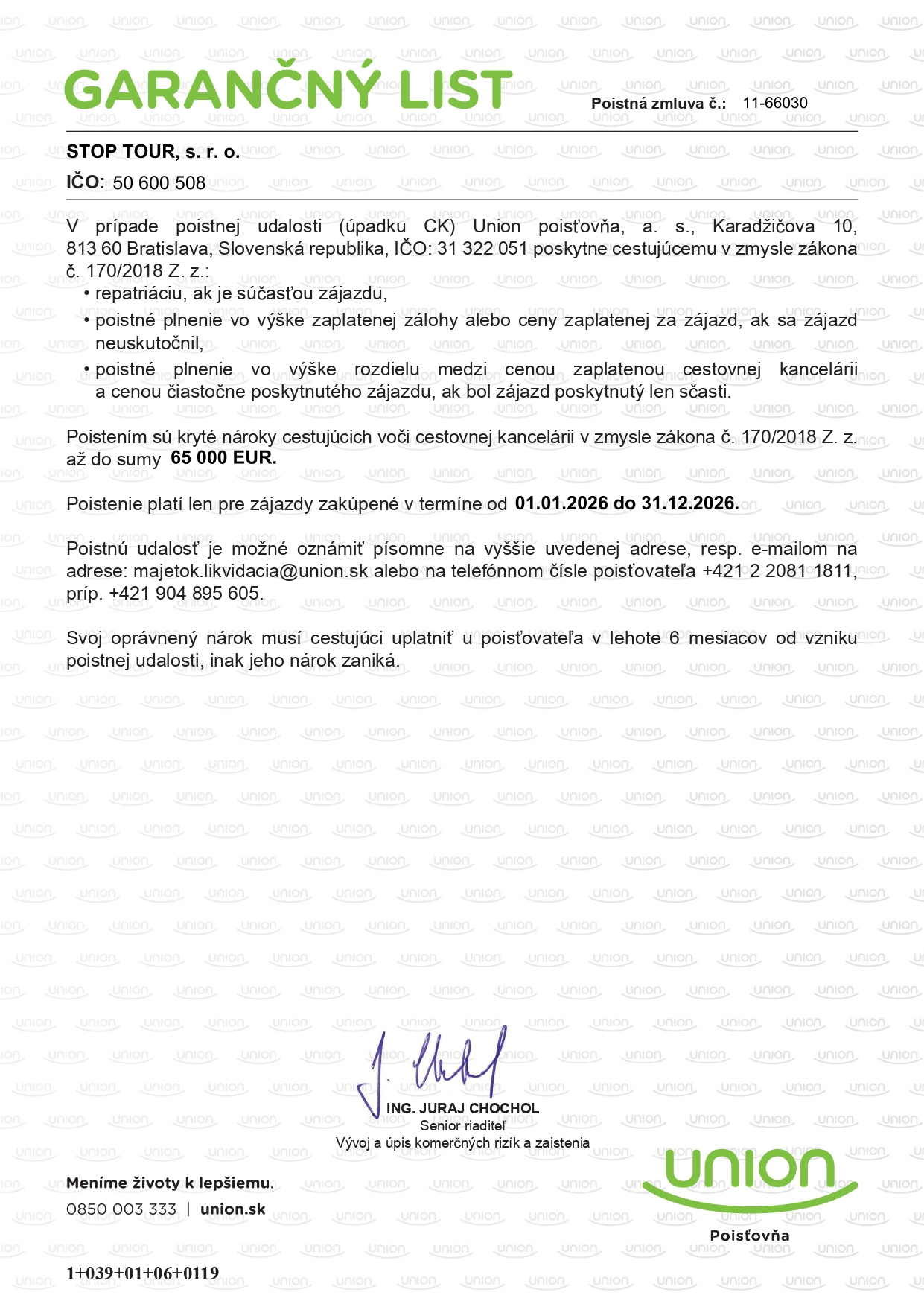 Naša CK STOP TOUR je v zmysle zákona č.170/2018 Z.z. poistená proti úpadku a insolventnosti v poisťovni Union poisťovňa, a.s. Ak by vznikla poistná udalosť, teda neposkytnutie zaplatenej služby z dôvodu preukázanej insolventnosti CK, poisťovňa poskytne plnenie vo výške preukázanej finančnej straty, ktorá vznikne poistenému neuskutočnením zaplatenej služby, maximálne však do výšky poistnej sumy. V cenách pobytov je zahrnuté poistenie proti úpadku a insolventnosti.